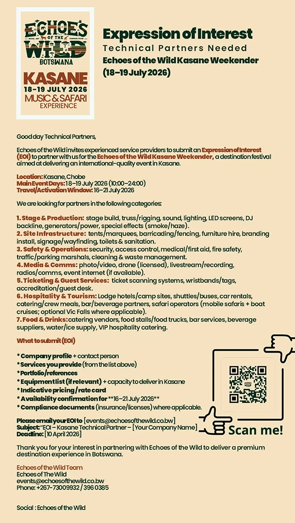 Echoes of the wild invites experienced service providers to submit an Expression of Interest (EOI) to partner with us for the Echoes of the Wild Kasane Weekender, a destination festival aimed at delivering an international-quality event in Kasane.